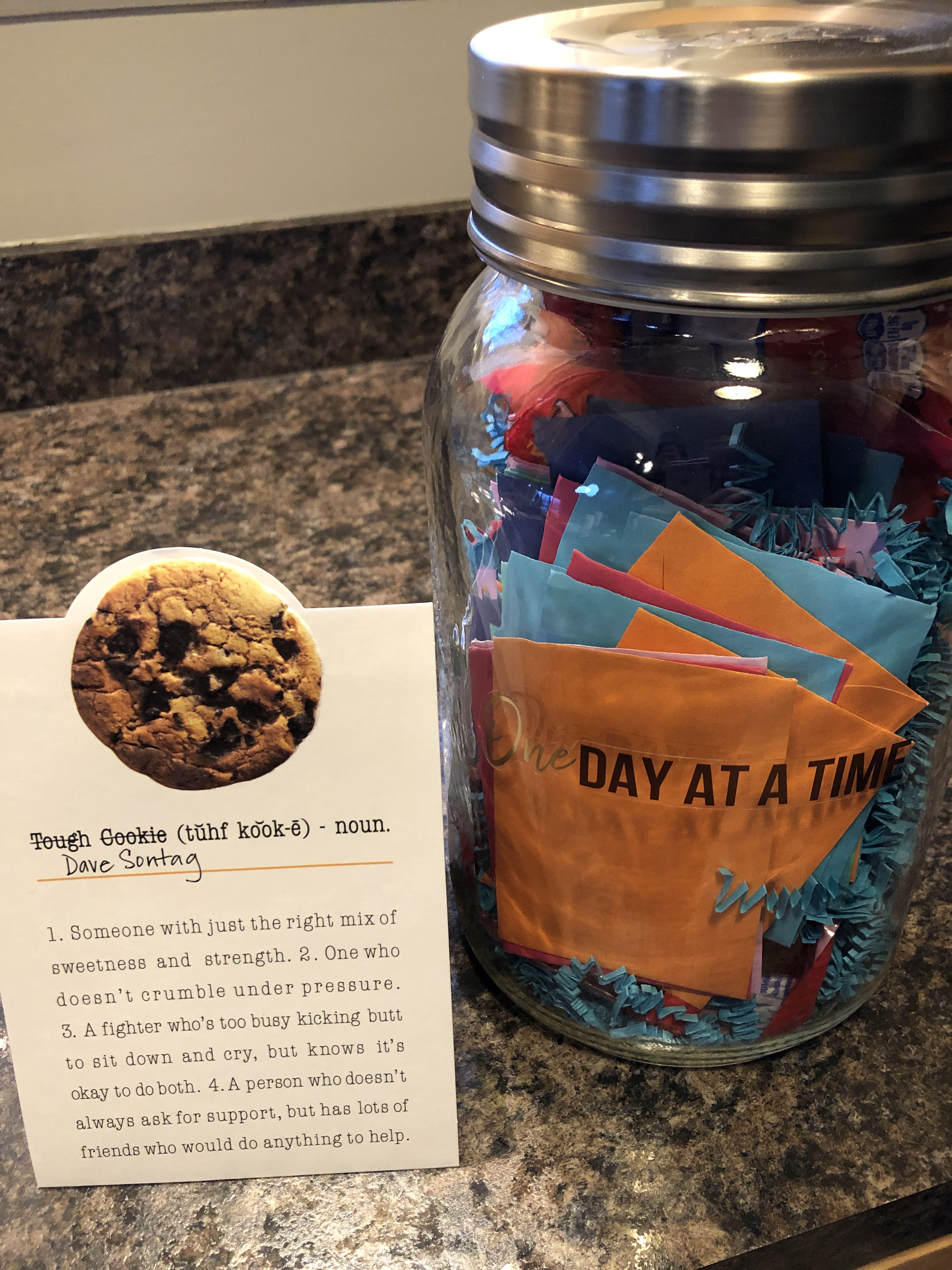Dave received this card and gift from Peanut (you know he gives everyone a special name) and the card could not have been more perfect. Sweetness. Strength. Doesn’t crumble. Fighter. Lots of friends. This is a recipe for “One tough cookie.” He is all of this 10-fold, but is really focusing on No. 3 – a fighter who’s too busy kicking butt to look back now. He’s going all out and determined to win this battle, one day at a time. He is one tough cookie.